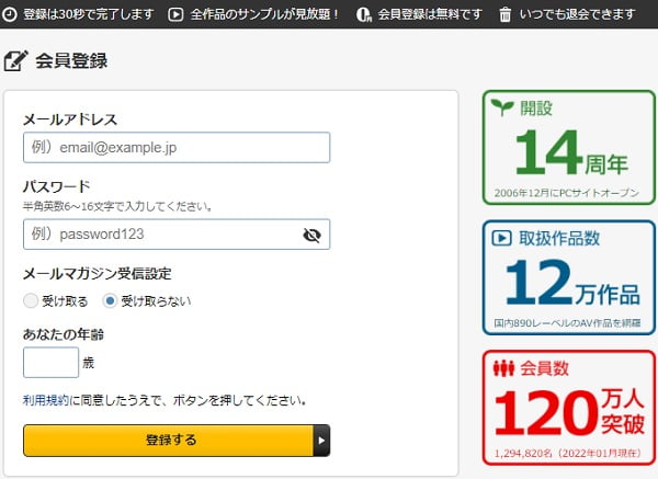 入力項目はシンプル。「メールアドレス」と自分の好きな(ログイン)パスワード。「メールマガジン受信設定」はお好みで判断。「あなたの年齢」は年齢確認(18歳以上)。本当の年齢を入力しよう。「登録する」をクリックすると作業終了。あっという間だ。