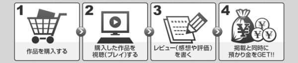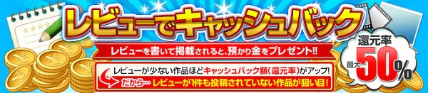 2,500円で購入した作品に1番目にレビューを投稿すれば、半額の1,250円のキャッシュバック!「預り金」として扱われ、次回以降の作品購入に充てることができる。