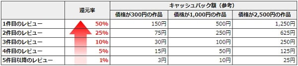 その作品のレビューとして「何件目のレビューか?」で還元率が大きく変化。